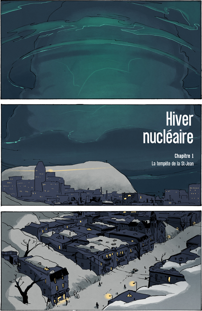 Voici la première planche de la bande dessinée Hiver Nucléaire de la bédéiste montréalaise Caroline Breault, que j’ai découvert dans Le Devoir grâce à la chronique de Fabien Deglise. J’ai lue toutes les planches (13) et ça commence très bien!