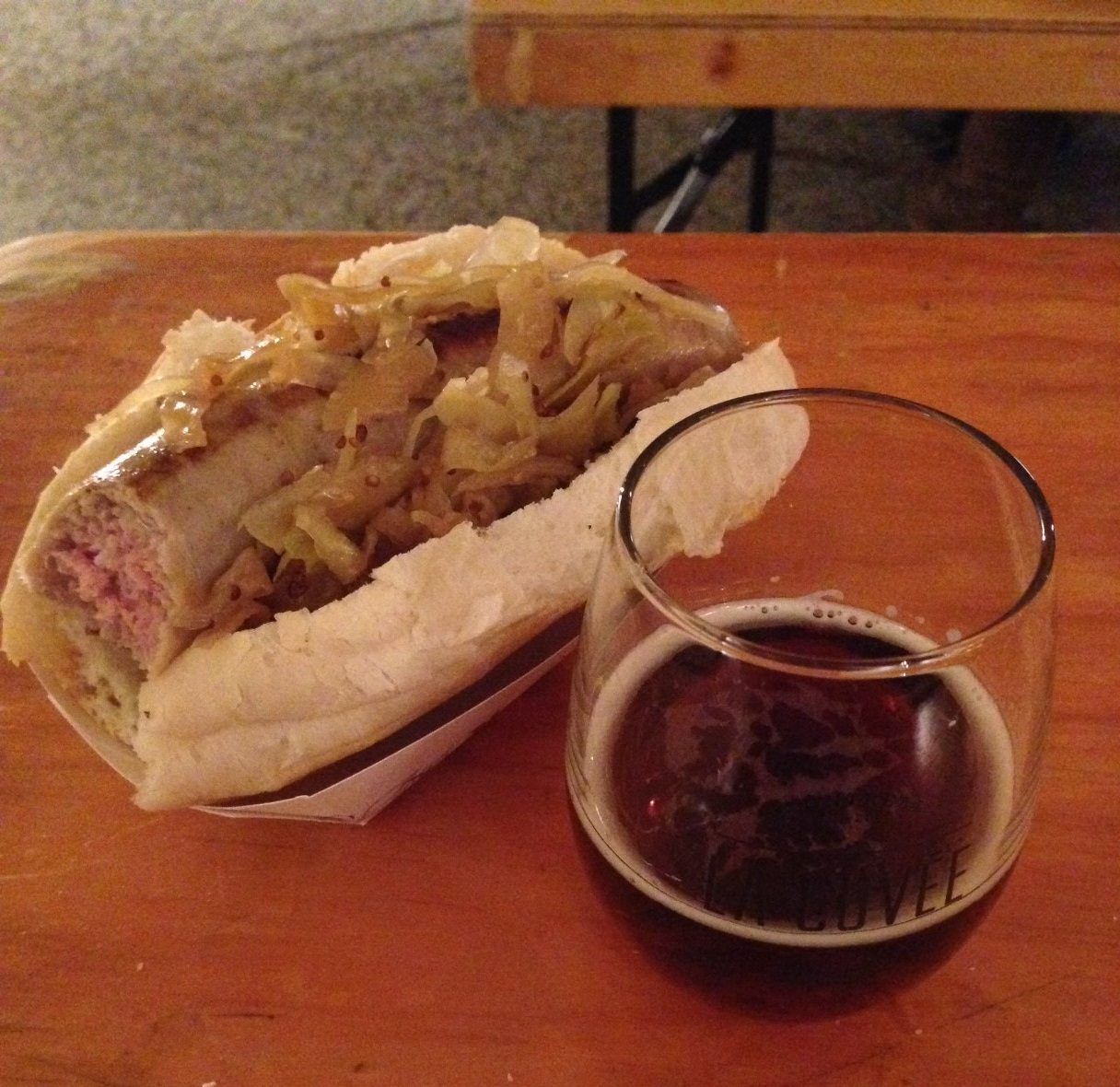 Par contre, la nourriture est excellente. J’ai lorgné sur le sandwich au porc effiloché BBQ de Pas d’cochon dans mon salon pour finalement me rabattre sur un Hot-dog «saucisse maison au lardon et cheddar avec choucroute et moutarde à l’ancienne» pour 7$ servis par la jolie fille de L’Entre-Pots. Le tout arrosé par un excellent verre de British à l’Érable de À la Fût.