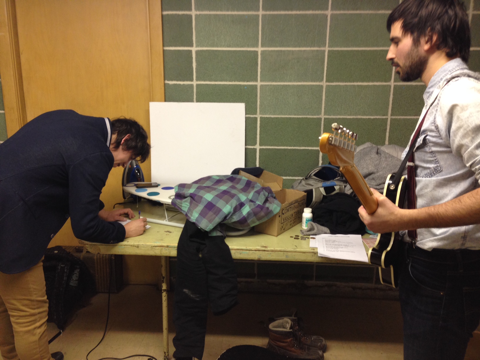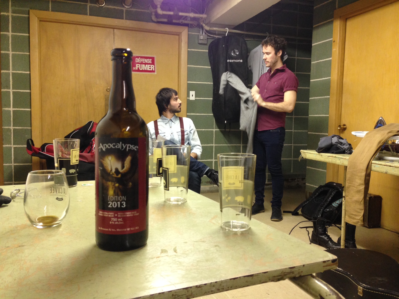 Un peu débité, je rencontre les gars de Cherry Chérie (formation rock’n’roll et rockabilly qui se retrouve sur la compilation Aurore Boréale). Les quatre musiciens sont allé déguster le sandwich au porc effiloché BBQ (miam!). Puis les gars m’invitent dans leur loge pendant qu’ils se préparent pour leur premier set (ils en auront deux durant la soirée). Des employés viennent leur porter quelques bières dont l’Apocalypse (9%), une succulente noire de Brasseurs RJ et à la merveilleuse Double Blanche (6.2%).